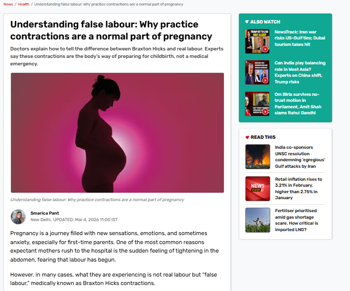 Highlights expert insights from Dr Sangeeta Rao, Consultant at Motherhood Hospital, Indiranagar, Bangalore, on understanding Braxton Hicks contractions during pregnancy. The article explains that these “practice contractions” are a normal part of pregnancy, helping prepare the uterus for childbirth. Unlike real labour, they are irregular, less intense, and often subside with rest or hydration. Experts emphasise recognising key differences to avoid unnecessary anxiety while seeking medical advice if contractions become regular or painful. The coverage reinforces Motherhood Hospitals’s focus on maternal awareness and safe pregnancy care.