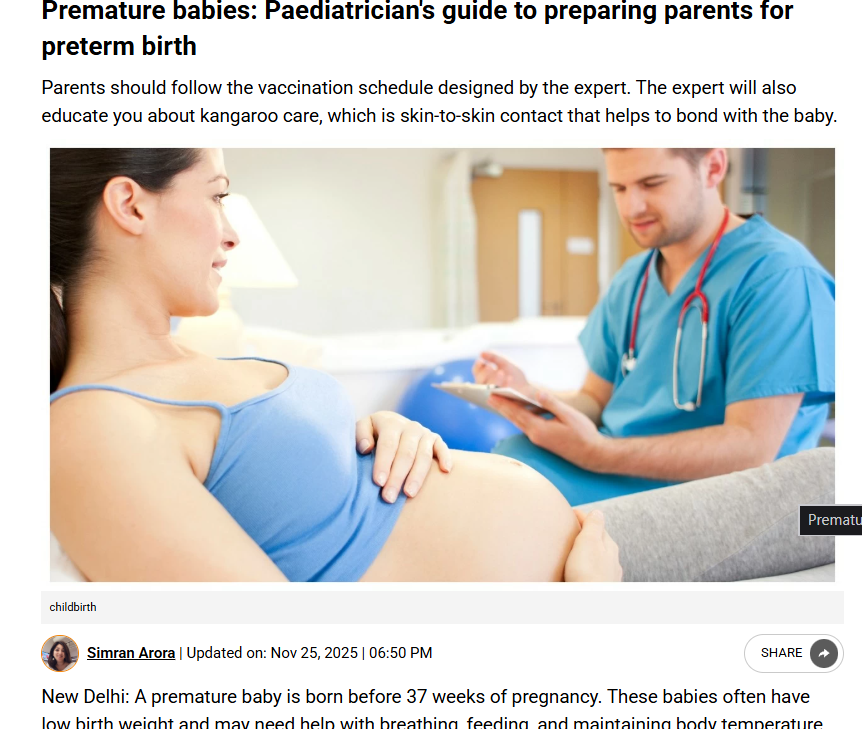 The article explains how parents can prepare for the challenges of a premature birth, noting that babies born before 37 weeks often need help with breathing, feeding and temperature regulation in a NICU. Parents may feel anxiety and uncertainty, but understanding care procedures and staying involved can make a significant difference. Dr. Akshay Mehta, Senior Consultant – Neonatology & Paediatrics at Motherhood Hospitals, Greater Noida, highlights the importance of regular antenatal checkups, discussing risk factors with doctors and learning techniques like kangaroo care, which boosts bonding and stability for preterm infants. Following expert-advised vaccination schedules and medical guidance supports healthy growth and development.