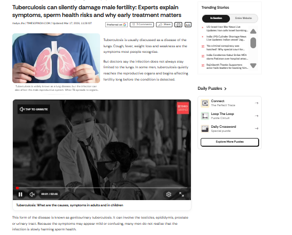 Explains how tuberculosis can silently affect male fertility, as detailed by Dr. Sandeep Talwar and Dr. Beena Muktesh. The article highlights genitourinary TB, its mild or misleading symptoms such as testicular swelling, blood in semen, and urinary issues, and the risks it poses to sperm production and transport. It stresses the importance of early diagnosis, timely treatment, and fertility assessment to prevent long-term reproductive damage and ensure safe conception.