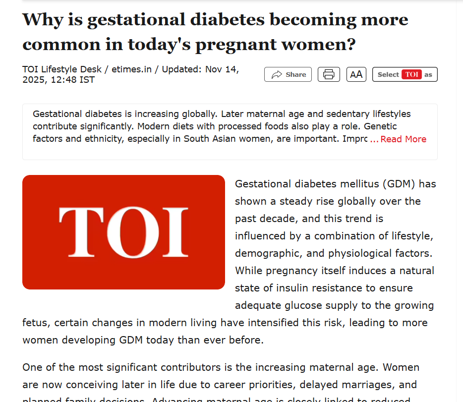 Gestational diabetes is becoming increasingly common among pregnant women due to a combination of lifestyle and demographic changes. Factors such as rising maternal age, sedentary habits, unhealthy diets, obesity and a family history of diabetes are contributing to higher rates of glucose intolerance during pregnancy. South Asian women also have a naturally higher risk due to genetic and metabolic predispositions, while better screening practices are identifying more cases than before. Early detection and management are crucial to reduce complications for both mother and baby. According to Dr Preety Aggarwal, an Obstetrician & Gynecologist at Motherhood Hospital (Gurugram, Gurgaon), understanding these contributors can help improve outcomes.